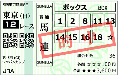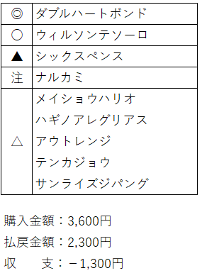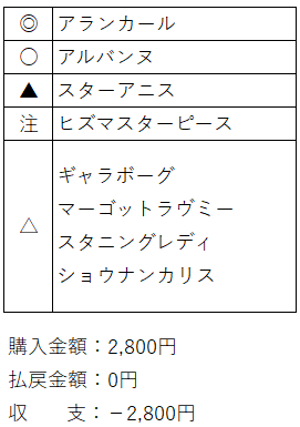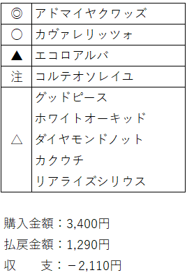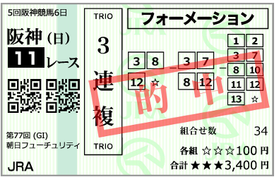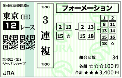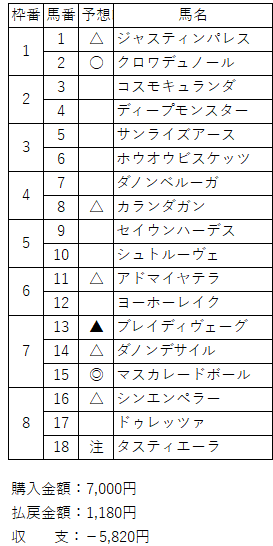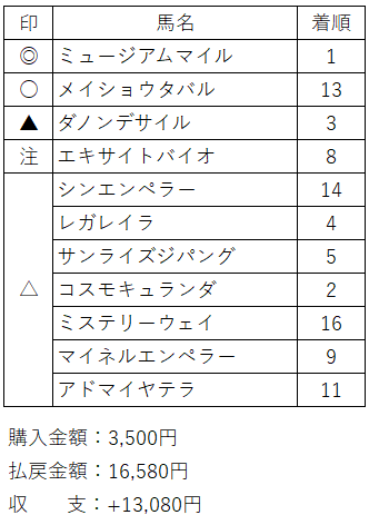 馬券は3連複フォーメーション。ミュージアムマイルを中心に組み立てました。最後まで悩んで買い目に加えたのが、12番人気のコスモキュランダ。万馬券的中となりました。嬉しいです。