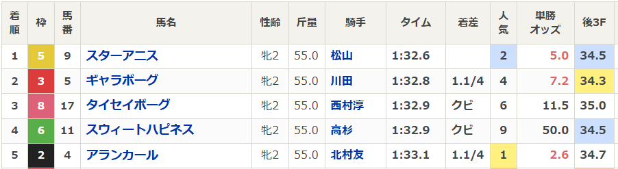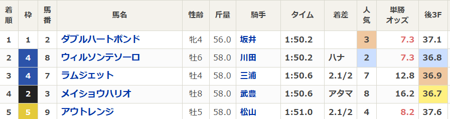 2着はコスモキュランダ。惜しい競馬でした。ミステリーウェイやメイショウタバルといった逃げ馬勢は惨敗でしたが、その中でよく粘ったと思います。やはり中山は得意な馬ですね。