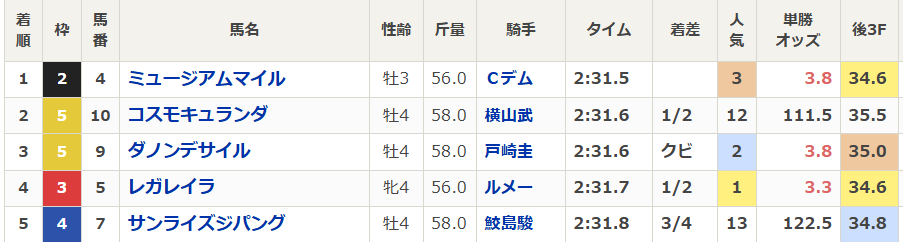 単勝3番人気のミュージアムマイルが勝ちました。皐月賞に続いて、これでGⅠレース2勝目です。直線ではコスモキュランダがそのまま粘り切りそうな雰囲気でしたが、最後はきっちり差し切りました。距離が不安とも言われていましたが、全く問題なかったですね。POG指名馬で、ずっと応援している馬なので素直に嬉しいです。Cデムーロ騎手もさすがでした。